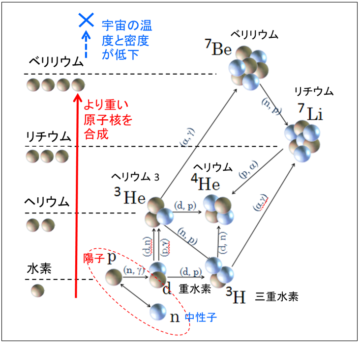 宇宙誕生直後の高温高密度期では、陽子や中性子は電子とニュートリノを交換しながら平衡状態(ベータ平衡)を保って存在しているが、平均エネルギーが0.1 MeV(温度にして10億度)くらいになると、陽子と中性子が反応し元素の合成が始まる。この時期の元素合成を星の内部での元素合成と区別してビックバン元素合成という。