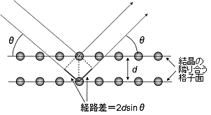 結晶のような周期的な構造を持つ物質に対して、ある波長λ の光が入射するとき、結晶面となす角度をθ として、ブラッグ(W.L. Bragg)の条件 nλ=2d sin θ(n は次数と呼ばれる正の整数、d は結晶の格子間隔)が満たされるような場合に光は回折される。これをブラッグ回折あるいはブラッグの法則という。回折される光が結晶面となす角度はθ に等しい。この角度をブラッグ角と呼ぶ。X線望遠鏡、スーパーミラーも参照。