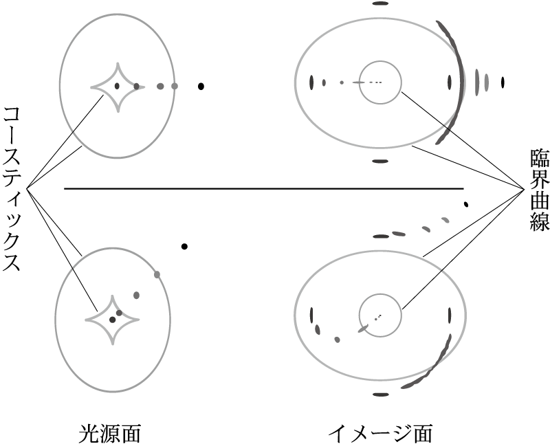 重力レンズ現象の用語としては、遠くにある光源から発せられた光の経路が、その途中にある天体の重力によって曲げられる重力レンズ現象において、光源面上で点状の光源(点光源)が無限大に増光される位置を結んだ曲線を指す。一般に、点光源がコースティックスを横切る際に、重力レンズのイメージ面で実際に観測される光の多重像が2個増減する。