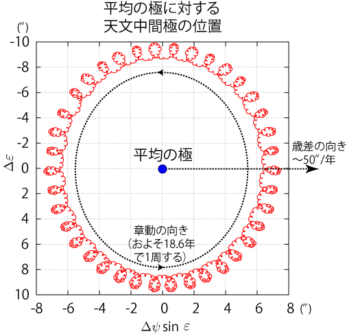 天の極は長期的には歳差によって黄道の極を中心に約23.4°の大きさで約26,000年かけて運動するが、短期的には章動によってさまざまな周期の運動をする。歳差のみを考慮した天の極の位置を平均の極、章動まで考慮した位置は天文中間極(以前は暦表極と呼ばれていた)と呼ぶ。