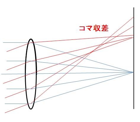 光軸に対して斜めに入射する光線が像面で一点に集まらないために起こる収差。