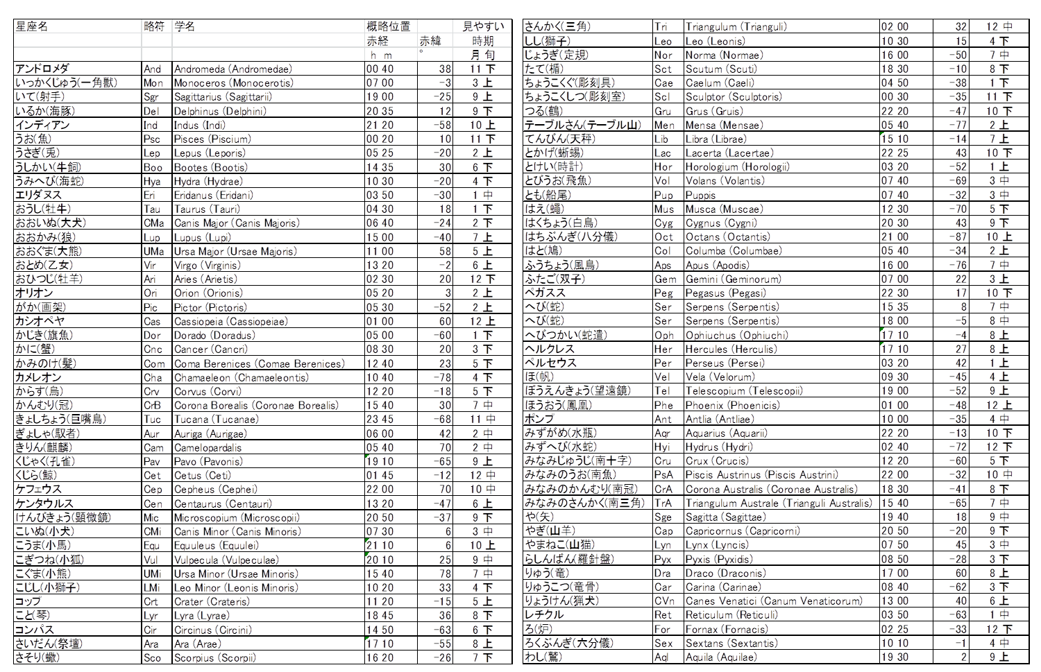 星座の一覧は本辞典の「有用な諸データの表」にもある。
