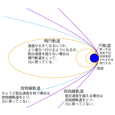 となる。ここで$G$ は万有引力定数。地球の場合には第二宇宙速度が脱出速度となる。脱出速度を越えない天体は楕円軌道を、ちょうど脱出速度を持つ天体は放物線軌道を、脱出速度を越える天体は双曲線軌道をとって運動する。