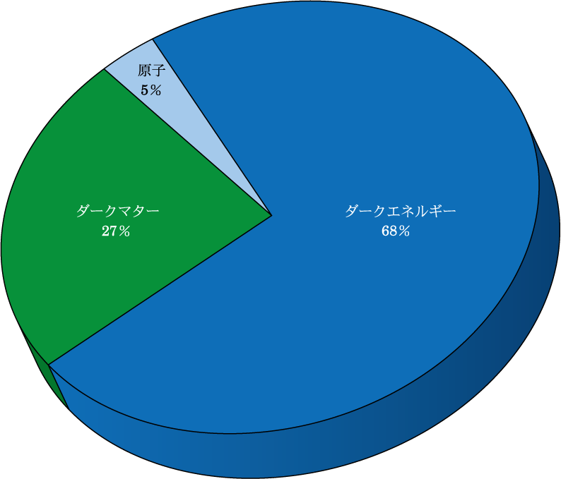 現在の宇宙の平均エネルギー密度のほぼ4分の1(27%)を占める正体不明の物質。暗黒物質とも言う。我々の知っている原子からなる物質(身のまわりにある通常の物質で、宇宙論ではこれをバリオンと呼ぶことが多い)は、全エネルギー密度のわずか5%以下でしかなく、ダークマターはその5倍以上ある。残りの約4分の3(68%)はダークエネルギー(暗黒エネルギーともいう)によって占められている。ダークマターはバリオンと同じく重力相互作用を及ぼすものの、それ以外の相互作用はほとんど及ぼさない。このためそれが放射する電磁波を観測して存在を確認することはできない。