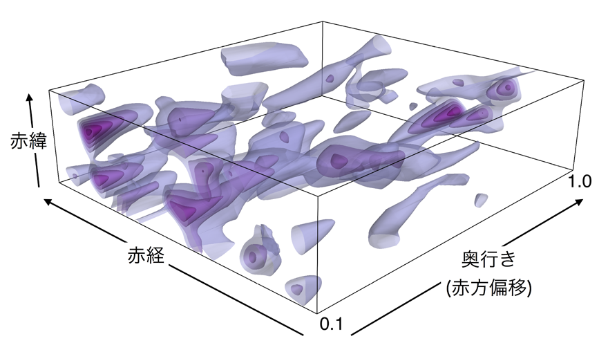 ダークマターハロー同士が重力で引き合い、合体を繰り返し、より大きなダークマターハロー(たとえば銀河群や銀河団を宿すハロー)へと成長していくと考えられる。ダークマターハローを直接観測することはできないが、背景天体の形を歪める重力レンズ効果や、ダークマターハローに束縛された高温プラズマから放射されるX線の観測などによって間接的にその存在がわかっている。