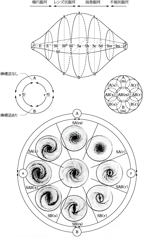 改訂ハッブル分類は右図(上)に示すようなサツマイモに似た分類立体で表現される。分類立体の中心軸がハッブル系列に対応し、左端の楕円銀河から右に向かってレンズ状銀河、渦巻銀河、不規則銀河と次第に晩期型が配置される。中心軸に垂直な断面には、棒構造と渦巻構造の多様性が展開される。ドゥ・ボークルールは、中心軸に沿った系列が銀河の主要な物理的性質を反映し、それに垂直な断面は微細な力学的多様性を表すと考え、中心軸に沿う系列に形態型指数 T を割り当て、形態を物理量のように定量的に扱えるようにした。分類型と形態型指数 T の対応関係は、ハッブル分類との対応も含めて下の表に示されている。