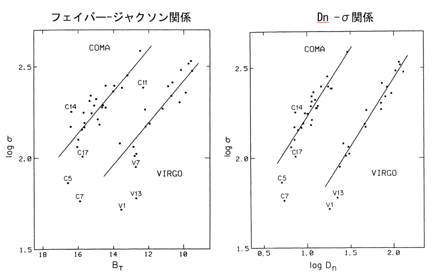 楕円銀河の中の星の運動の速度分散 σ と一定の面輝度 n (mag/arcsec2) における銀河の直径 Dn との間の相関関係。1987年に、「七人の侍(Seven Samurai)」と称されたドレスラー(Alan Dressler)ら7人の研究グループによって提案されたフェイバーージャクソン関係(1976年)の改訂版である。楕円銀河に対する距離指標関係式として、宇宙の大規模構造、銀河の特異速度場、ハッブル定数の決定など幅広い分野の研究に用いられている。宇宙の距離はしごも参照。