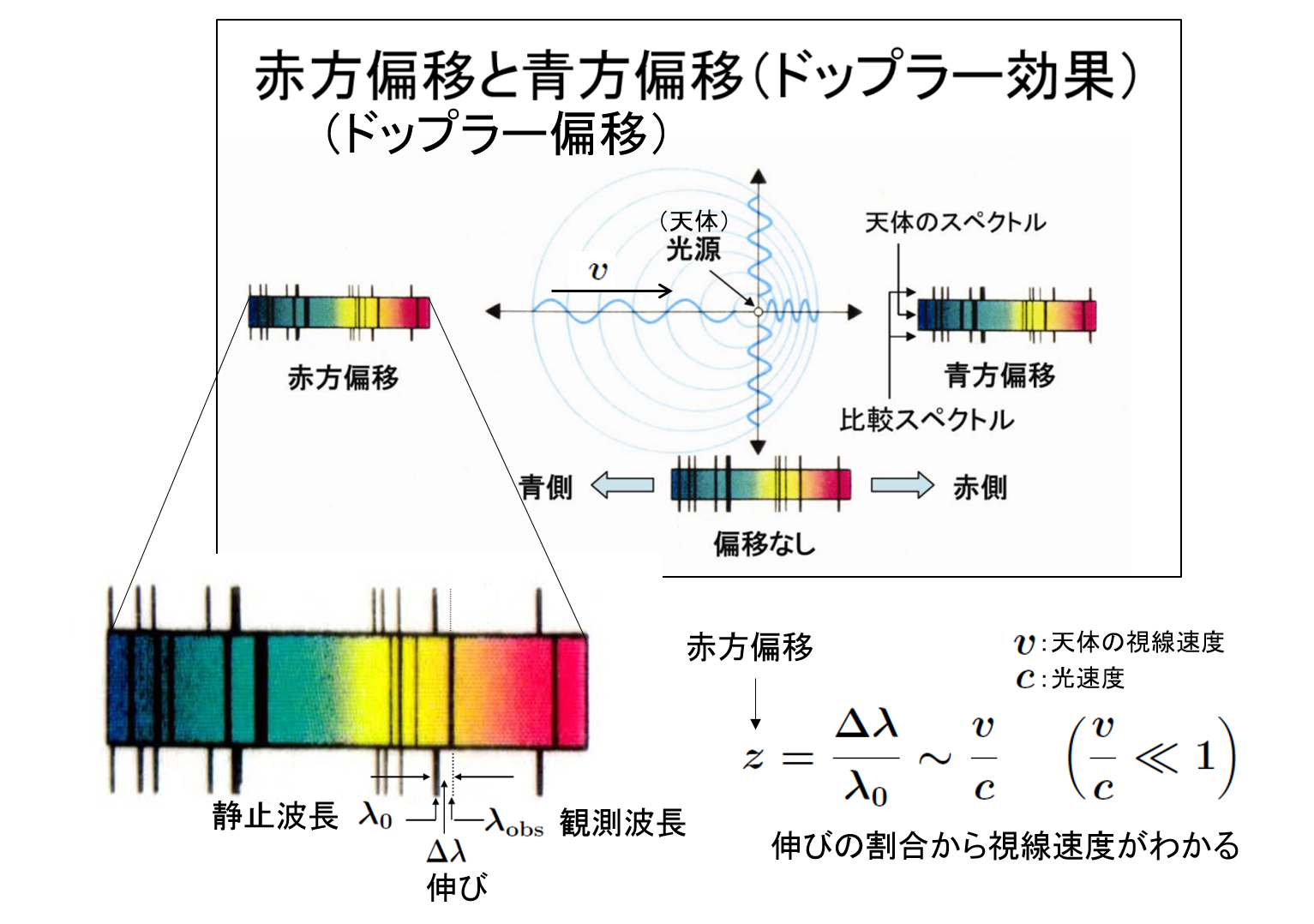 天体のスペクトル中の吸収線や輝線の波長のずれから天体と観測者の視線方向の相対速度を知ることができるドップラー効果は、天文学の基本的な研究手段である。ドップラー効果は天文学の発展に大きな役割を果たしていることに加え、現代社会のさまざまな分野で応用されている(例:野球で投球スピードを測るスピードガン、ドップラーレーダーなど)。