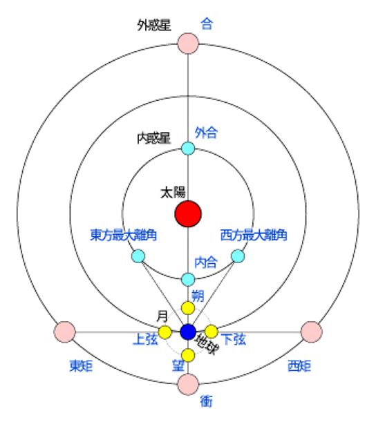 関連画像 画像をクリックすると拡大されます * 惑星の合、衝、矩、最大離角(黄道の北側から見たときの位置関係)(クレジット:国立天文台暦計算室) https://eco.mtk.nao.ac.jp/cgi-bin/koyomi/cande/phenomena.cgi