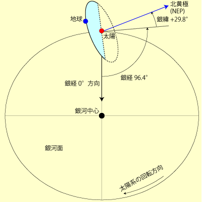 ちなみに、NEPの赤道座標は(18h00m00.s, +66°33'38."6)(J2000)、また銀河座標は(96.°3840, +29.°8114)(J2000) である。また、天の川銀河(銀河系)と太陽系の関係は図のようになる。
