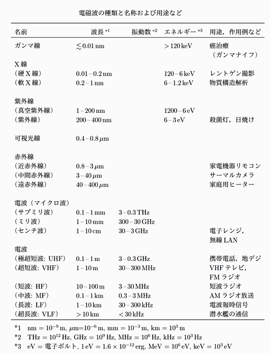 電磁波は、波長によって性質が変わり、また物質との相互作用の仕方が変わるので、波長帯毎に異なった名前で呼ばれることが多い。波長の短い方から順に、ガンマ線、X線、紫外線、可視光(可視光線)、赤外線、電波と呼ばれるが、それぞれの中でさらに細分して呼ばれることもある(図2)。ただし、境界波長(エネルギー)はそれほど厳密に決まっているわけではない。図2は理科年表2017年版に基づいて作成したものである。とくに、X線とガンマ線の区別は波長によるものではなく、原子核の状態の遷移によって発生するものをガンマ線、電子の状態の遷移によって発生するものをX線と呼ぶ。