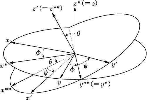 たとえば、まず $z$$\phi$ の回転を行い、$(x^*, y^*, z^* (=z))$ に変換する。次に $y^*$ 軸周りに $\theta$ の回転を行い、$(x^{**}, y^{**} (=y^*), z^{**})$ に変換する。最後に $$z^{**}$ 軸周りに $\psi$ の回転を行い、$(x', y', z' (=z^{**}))$ に変換する。この $\phi、\theta、\psi$ がオイラー角の1つの流儀である。
