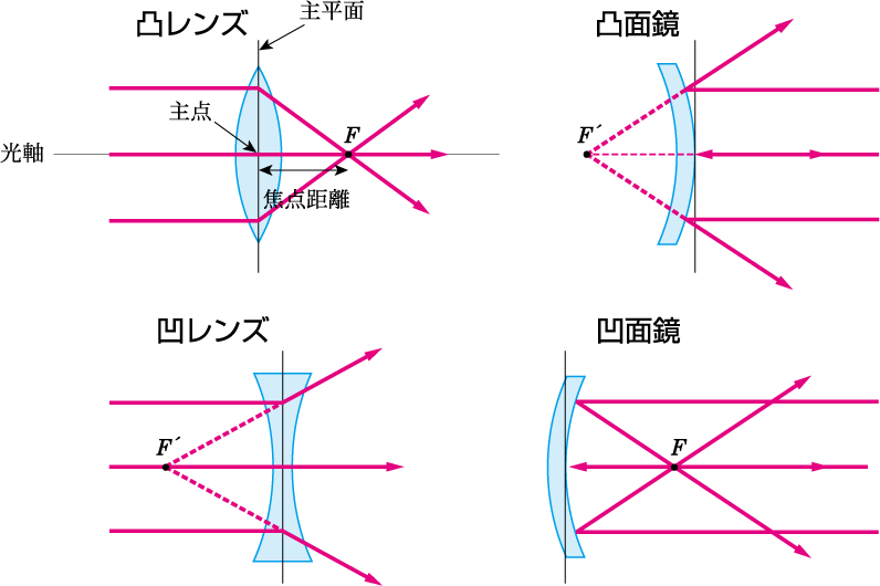 ここでは幾何光学における焦点の説明をする。幾何光学においては、光学系の光軸に平行に入射してきた光が光軸と交わる点を焦点と呼ぶ。焦点を通る光軸に垂直な平面を焦点面と呼ぶ。カメラレンズなど結像透過光学系では、光をどちらから入射するかによって焦点は実焦点と虚焦点の2つできる。このとき、それぞれの焦点を共役焦点と呼ぶ。2次曲面からなる反射鏡の場合も同様である。放物面の場合一つの焦点は無限遠となる。