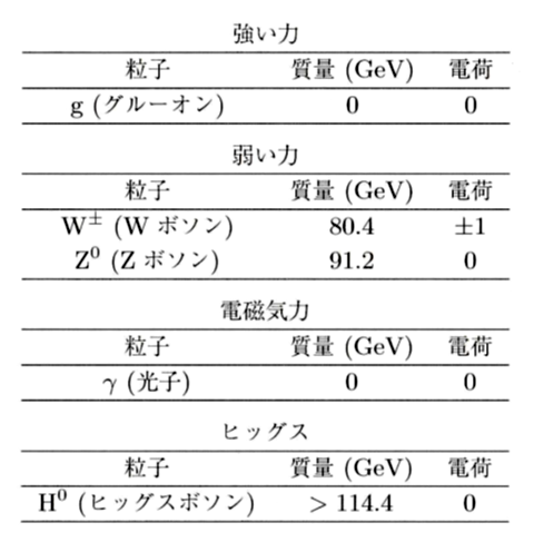 強い力は8種のグルーオン、弱い力は3種のウィークボソン(正負の電荷を持つWボソンと電荷を持たないZボソン)、電磁気力は光子、そして重力は重力子(未発見)という、それぞれゲージ対称性(ゲージ理論を参照)をもつボース粒子によって媒介される(粒子をキャッチボールのように交換しあうことで力が作用する)。
