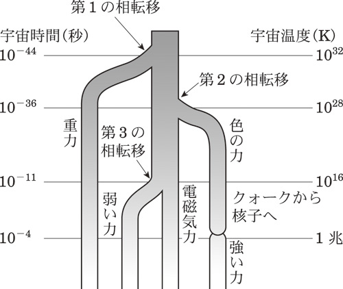 素粒子の統一理論では、四つの力はプランクエネルギーと呼ばれる 10 19 GeV(GeV=109 eV;eVは電子ボルト)程度以上という超高エネルギーではもともと一つの力だったと想定されている。この力が宇宙の進化につれてまず重力と大統一力に分かれ、次に 10 16 GeV程度で大統一力が電弱力と強い力に分かれ、100GeV程度で最終的に電弱力が弱い力と電磁気力に分かれて現在の宇宙にみられる四つの力となる。最初の力の分化についてはわかっていないが、大統一理論によると、強い力と電弱力の分化と弱い力と電磁気力の分化は、それぞれ違う種類のヒッグス粒子が真空に凝縮して真空の相転移を起こすことが原因と考えられている。電弱力を分化するヒッグス粒子は2012年に発見された。