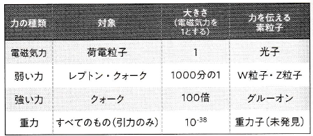 強い力はクォーク同士をくっつけて陽子や中性子を作ったり、陽子と中性子をくっつけて原子核を作ったりする時に使われる。弱い力は素粒子の種類を変える力である。電磁気力は電気の力と磁気の力を総称したものであり、重力は質量を持つ全てのものの間に働く引き合う力で、「万有引力」とも呼ばれる。