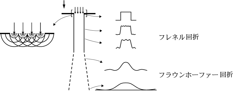 平面波が遮光板に設けられた開口部を通過するときに、開口部から 近い位置で観測される回折現象。開口部の各点からの(電磁)波の 干渉により計算される。開口の形状に、縁による回折の効果が加わ ったものと考えることができる。フラウンホーファー回折も参照。