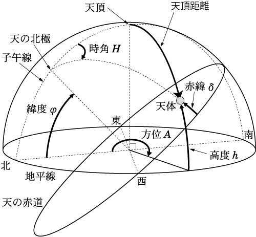 方位角は北を 0°とし、天頂方向を軸として時計回りに東を 90°、南を180°、西を 270°のように測る。高度は地平線から測った天体の仰角で、地平線方向が 0°、天頂方向が 90°となる。高度と逆に天頂から測った角度を天頂距離と呼ぶ。天体の高度 h と天頂距離 z の関係は h = 90°- zである。