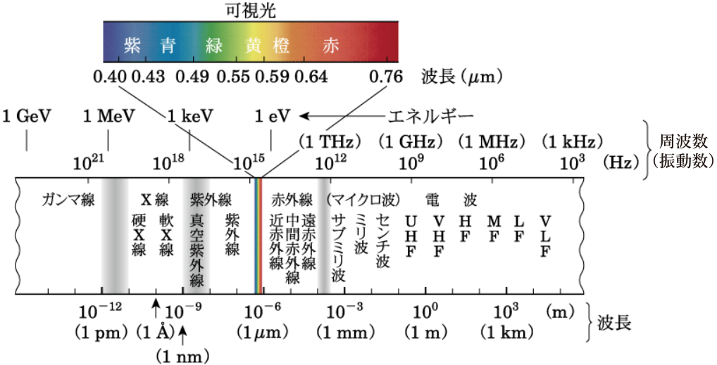 波長が1 μm から400 μm 程度の範囲にある電磁波の名称。さらにこの波長範囲で、波長が短いもの(1-3 μm)、中間のもの(3-40 μm)、長いもの(40-400 μm)をそれぞれ、近赤外線、中間赤外線、遠赤外線ということがある。イギリスのハーシェル(W. Herschel)が1800年に、プリズムを通した太陽光のスペクトル中で、いろいろな色の位置に温度計をおいて温度上昇を調べたが、赤よりさらに外側で温度計の温度が最も上がることから赤外線の存在を発見した。