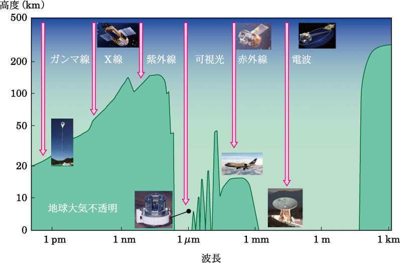 赤外線のうち地球大気に吸収されずに地上まで届くのは近赤外線の一部である。このため、赤外線の観測は主にスペース(宇宙空間)から行われる。ただし、中間赤外線の一部は、乾燥した高地では地上から観測できることもある。大気の窓も参照。