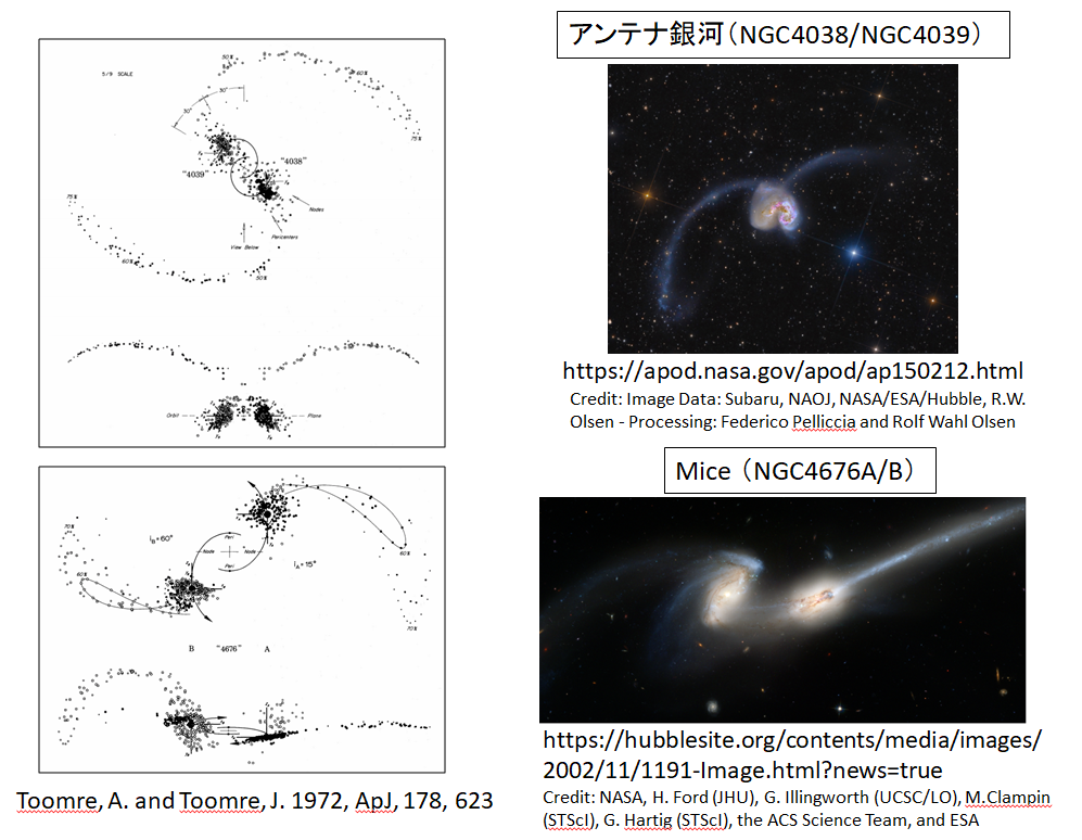 相互作用銀河の理解はコンピュターシミュレーションの発展とともに深まった。衝突する二つの銀河の質量比や衝突パラメータの違いなどにより、潮汐相互作用によってどのような形のパターンが発生するかをはじめてコンピューターシミュレーションで示したのはトゥームレ兄弟(Alar/Juri Toomre)で、1972年のことであった。この論文では、銀河を質点として扱い、一方の銀河(質点)の周りに、銀河円盤(ディスク)を模した平面上に120個のテスト粒子(質量が質点=銀河に比べて無視できる)をおいて、そのテスト粒子が作るパターンを調べた。現在は、星とガスとダークマターを組み込んだ、より現実の銀河に近い潮汐相互作用のシミュレーションが多数行われているが、トゥームレ夫妻の論文と基本的に同じ結果が得られている。
