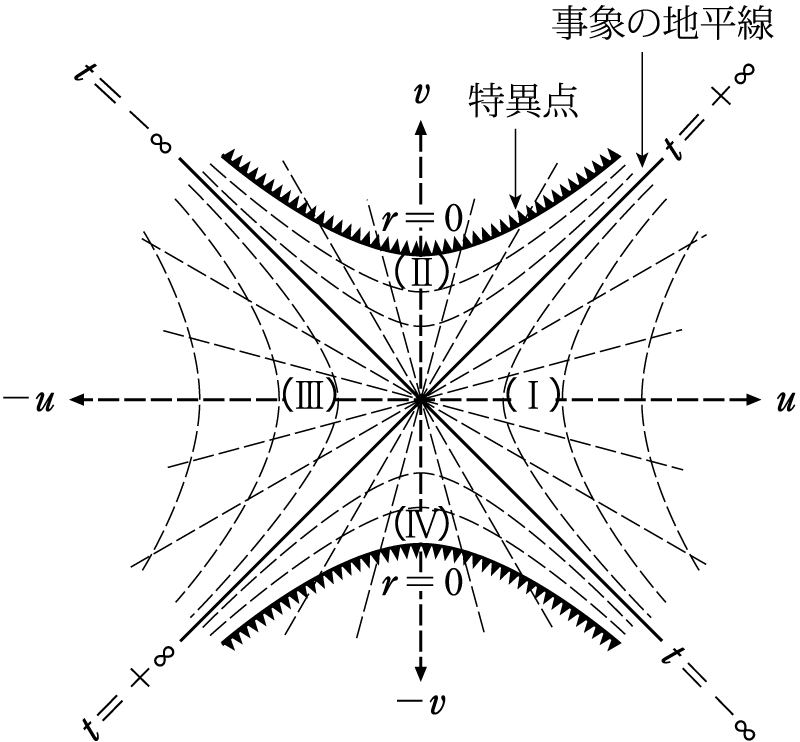 電荷をもたない球対称ブラックホール時空を表すシュバルツシルト解では、事象の地平面で計量(メトリック)のある成分が無限大になってしまい、一見事象の地平線で時空の特異点であるかのように見え、シュバルツシルト特異点と呼ばれたこともあった。実際には事象の地平面で時空の曲率は無限大にならず、事象の地平面は特異点ではない。1960年、クルスカル(M. Kruscal)とセケレス(G. Szekeres)は独立に、この時空に対して事象の地平面でメトリックのあらゆる成分が無限大にならないような座標系 $(u,v)$ を見出した。