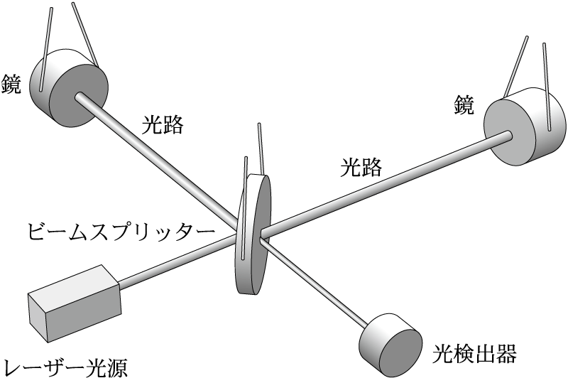 アメリカの物理学者マイケルソン(A. Michelson)が考案した二光線干渉計で、レーザー光源からの光をビームスプリッターで直交する2つの方向に分け、それぞれの先に置かれた鏡で反射させ、再びビームスプリッターに戻して干渉させる。2つの光の位相差により光の振幅が変わるため、光路差を波長よりずっと短い精度で検出することができる。光速度が一定であることを示したマイケルソン-モーリーの実験(1887)で有名である。重力波検出用レーザー干渉計もこの原理に基づいている。