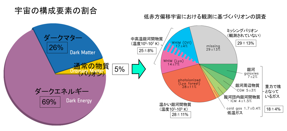 現在の標準宇宙モデルによると、宇宙はダークエネルギー(約69%)、ダークマター(約26%)、バリオン(約5%)から構成されている。2012年時点での調査によると、この5%のバリオンのうちで、重力の影響で塊となって存在する銀河、銀河を包み込む銀河周辺物質、および銀河団内にある銀河間物質は約18%、塊ではなく広く広がった温度103-105 Kと比較的低温度の銀河間物質が約28%、それより高温(105-107 K)の中高温銀河間物質(Warm and Hot Intergalactic Medium: WHIM)が約25%で、残りの約29%が観測されていないミッシングバリオンである(図参照)。