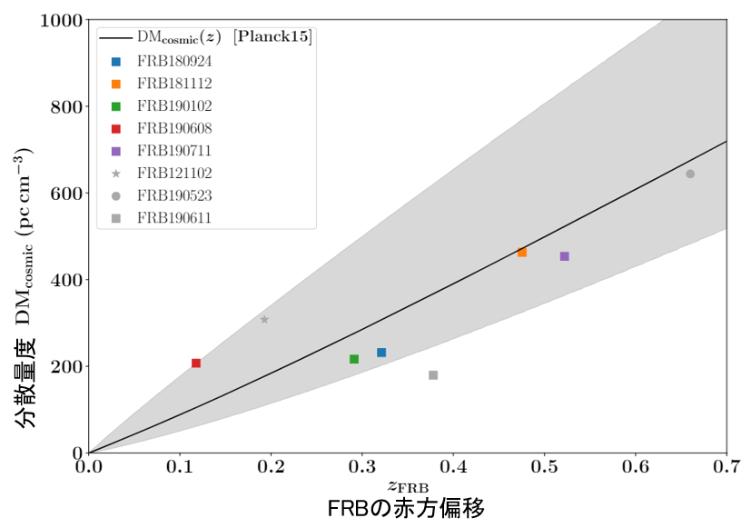 2020年に発表された、高速電波バースト(FRB)から測定される銀河間空間における分散量度と赤方偏移の相関関係の発見(図参照)により、宇宙には予想通り約5%のバリオンがあり、その内の約80% (ミッシングバリオンを含む) が銀河間プラズマとして存在していること自体は明らかとなった。分散量度は宇宙の電子の柱密度に比例し、高速電波バーストはこれを直接測定しているので、銀河間プラズマからの放射を直接捉えて分布を描きだしたわけではないが、ミッシングバリオン問題は解決した(ミッシングバリオンはない)と考えられている。