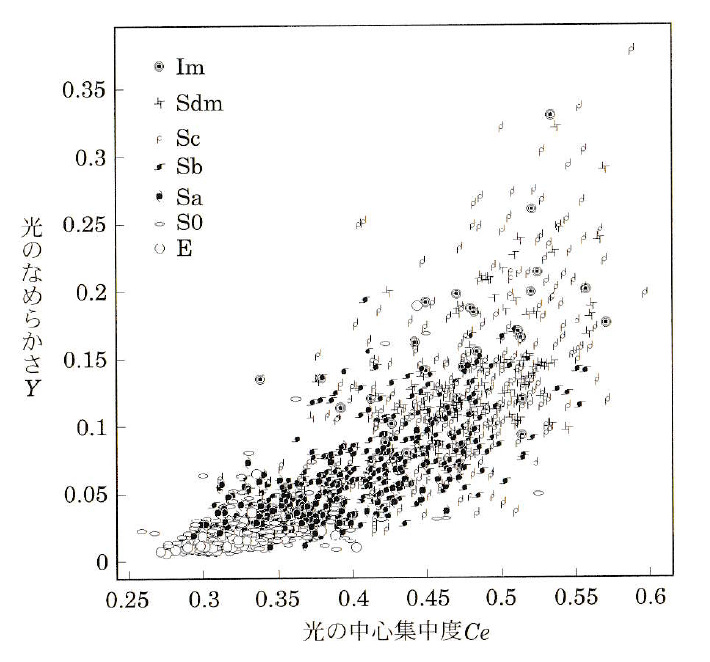 シュミット望遠鏡によるサーベイ写真乾板のディジタル化や、CCDを用いた大規模サーベイが可能になった近年では、何万個もの銀河のディジタル画像が利用できるようになった。そこで、人間がそれらを眼視検査するのではなく、銀河画像から抽出した定量的なパラメータで、従来の形態分類に相当する体系をつくるさまざまな研究がおこなわれている(図5)。