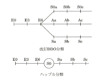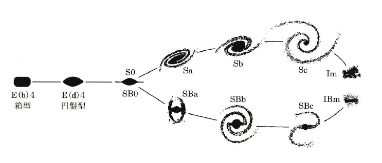 1930年代にハッブル(E. Hubble)が提案した音叉図に基づくハッブル分類が最も有名で、今日でも広く使われている(図1)。1950年代の終わりに、ドゥ・ボークルール(G. de Vaucouleurs)が渦巻銀河の渦巻腕の多様性を取り込んでハッブル分類を3次元的に表現したドゥ・ボークルール分類(改訂ハッブル分類とも呼ばれる)を提案した。ハッブル分類の改訂は、楕円銀河に箱型と円盤型という2種類があることが分かった1980年代後半以降にも提案されている(図2)。また、1976年にはデイビッド・ダンラップ天文台のシドニー・バンデンバーグが、銀河団中に貧血銀河が見られることから、レンズ状銀河(S0銀河)の位置づけを見直す改定DDO分類を提案した(図3)。