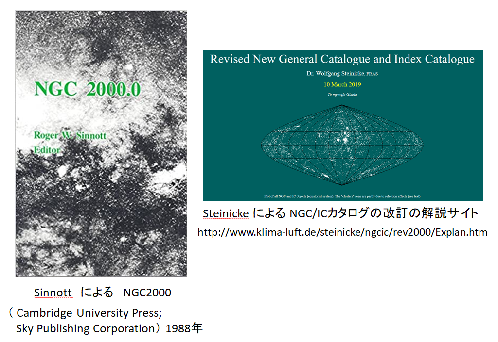 1988年にはシノット(Roger Sinnott)が、NGCカタログとICカタログに含まれる 13226 天体全てを2000年分点の座標で記述した NGC2000 カタログを出版した。これは現在ウェッブで公開されている。また、ドイツのシュタイニッケ(Wolfgang Steinicke)は、 1980年代初頭から現在まで、NGC/ICカタログ天体に関するデータの改良と充実を継続している。そのデータは、非営利目的には自由に利用できる。沼澤茂美、脇屋奈々代は2009年に、NGC/IC天体の写真集「NGC・IC天体写真総カタログ」を発行した。