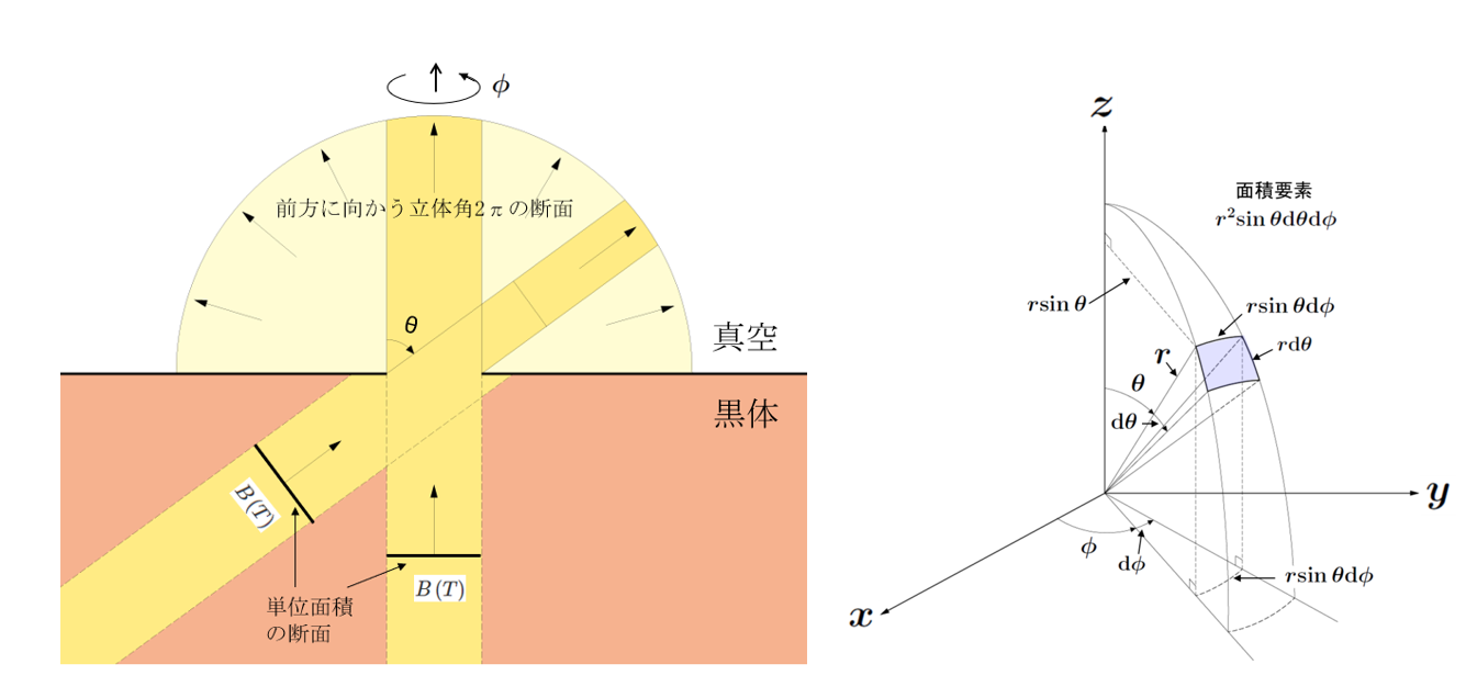 黒体の表面(単位面積)から前方のあらゆる方向に向かって単位時間に放射される全エネルギー $I\,(T)$ は、$B\,(T)$ を出射方向毎に重み ${\rm cos}\,\theta$($\theta$ は表面に垂直な方向と出射方向とのなす角度)をつけて前方に向かう立体角 $2\pi$ に渡って積分した値となる。すなわち、