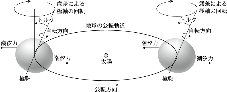 南北に扁平な回転楕円体に近い形状をしている地球に対し、黄道面近くにある月や太陽から引力が及ぼされると、地球の重心に対する力との差分(潮汐力)が偶力となって自転軸を起こそうというトルクが働く。すると、あたかも回転するコマが首を振るように、回転する地球も徐々にその向きを変えていく。この首振り運動を歳差と章動と呼ぶ。歳差はこの運動の永年項、章動は周期項である。前者はより厳密には赤道の歳差と呼び、地球の自転軸が黄道の極に対して約23.4°傾いたまま、自転とは逆向きに周期約26,000年で回転する。