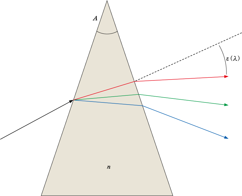 透明な材質からなる多面体光学素子で、光を分散、屈折、全反射、複屈折させるのに用いられる。頂角 A 、屈折率 n(λ) の三角プリズムによる、波長 λ の光の屈折角 ε は、薄いプリズムの場合