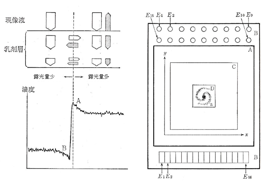 露光量が多かった場所(左下図のA点の右側)は、現像が進むにつれて現像能力を低下させる反応生成物が多量にでき現像が抑えられる。露光量の少なかった場所(左下図のB点の左側)では、反応生成物が少なく新鮮な現像液が拡散してくるので現像が進む。このため、二つの場所の境では図に示すように、A点付近は濃度がより高く、B点付近はより低くなる。
