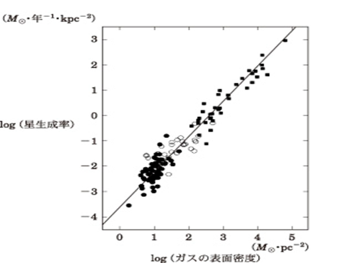 星間物質の平均密度とそこでの星形成率(星生成率ともいう)とのあいだにべき乗則が成り立つとする法則。観測による裏付けをケニカットが示してからはケニカット・シュミット則ともいうようになった。もともとは、星間物質が自発的に収縮して星形成が起こるならべきは1に、星間物質の衝突によって起こるならばべきは2になるはずで、実際にはその中間の値となることが予想されていた。観測の都合から、銀河面に対して垂直方向に積分した値同士の関係として記述することが多い。多数の銀河に対する観測結果から、星形成率は星間物質の柱密度の1.4乗に比例して増えるとするのが標準的である。ただし、なぜ多数の銀河で共通して1.4乗のべき乗則が成り立つのかについては、まだよくわかっていない。
