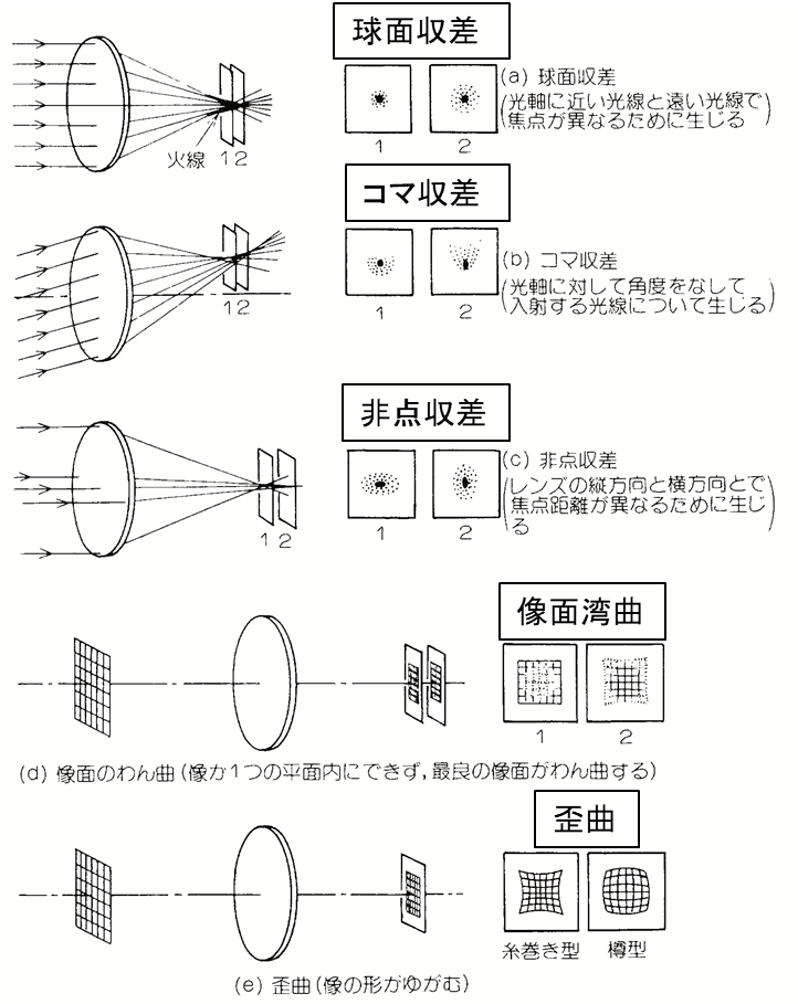 レンズや鏡の形状により生じる光学収差には数学的な考察から、球面収差、コマ収差、非点収差、像面湾曲、歪曲という5つの基本的なパターンがあることが1857年のザイデル(L. von Seidel)の研究で示された。波面収差Wを瞳座標(ρ, θ)と入射角 $\alpha$ で多項式展開すると、3次までの展開式は