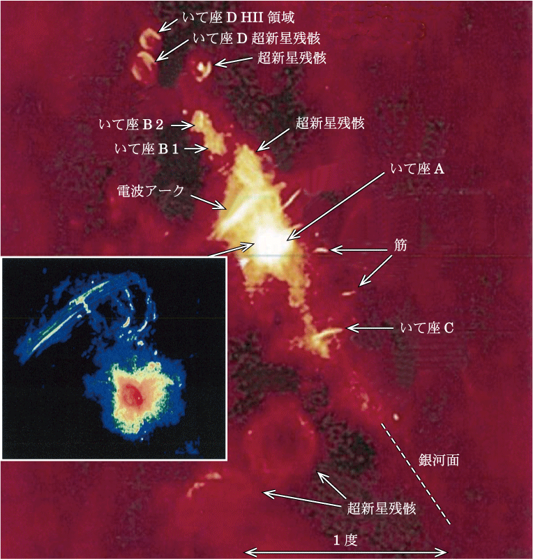 天の川銀河(銀河系)の中心に対応する電波天体。地球から見ていて座の方向に見える。初期の電波観測ではいて座で最も強い電波源であったため、この名で呼ばれるようになった。分解能が高い観測が行われるようになると、電波放射の特徴および形態から3つの部分に分けられるようになり、今では、電波アークとアーチ状フィラメントとを除いた銀河中心を含む部分だけをいて座Aと呼ぶ。そこにある直径3分角ほどの環状の電波源は超新星残骸、その西寄りにある点状電波源いて座A*が天の川銀河の中心にあるブラックホールに対応する。いて座A*周囲では回転するガス円盤と落ちつつあるガスによる渦状の天体(いて座A*ないしミニスパイラルと呼ばれる)が電波や赤外線で観測されている。