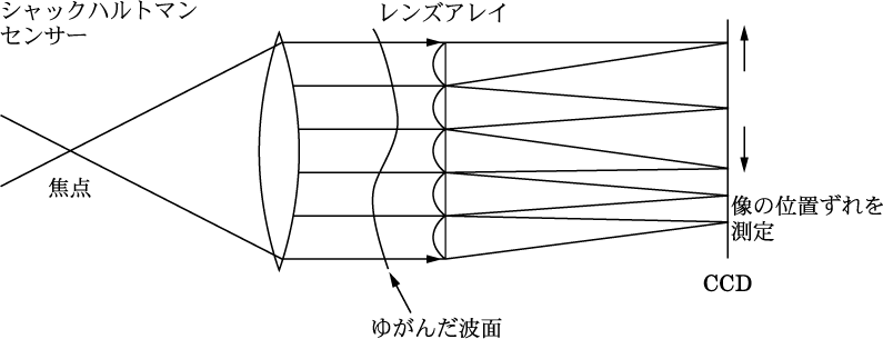 光波面のゆらぎを測定するための装置。望遠鏡で参照星を観測するとき、入射瞳位置に置いたマイクロレンズアレイで入射光束を小開口に分割し、それぞれのレンズが結像する多数の参照星像の位置を測定する。大気のゆらぎで光波面が乱されると、参照星像の位置がその小開口を通過した光波面の傾きに比例して変動する。このため参照星像の位置の変動を測定するとその小開口部での光波面の傾斜(1次微分)ベクトルを測定することができる。波面の1次微分ベクトルの分布を測定できれば、波面全体のゆらぎ分布を求めることができる。一方、主鏡鏡面誤差など、望遠鏡光学系の誤差成分は変化しないか、変化しても大気変動より遅い。そのため、シャックハルトマンセンサーでの測定を多数回繰り返すと大気乱流によるランダム変動成分は平均化されて消える。こうして、光学系の誤差による光波面誤差を残留平均値の分布から推定することができる。ハルトマン検査も参照。