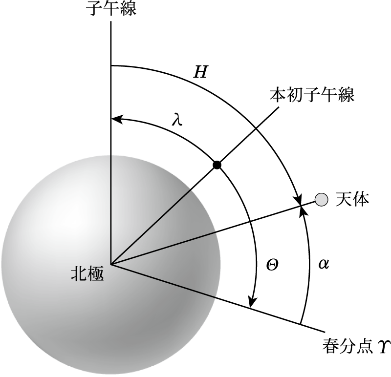 春分点の時角のことで、子午線に対する春分点の方向、あるいは春分点を基準とした地球の自転量と考えてもよい。恒星時は15°を1時間の割合で換算して時分秒の単位で表す。つまり、恒星時とは春分点が子午線を通過してからの時間と考えることもできる。 とくに本初子午線を基準とする場合をグリニッジ恒星時、任意の子午線の場合を地方恒星時と呼んでいる。それぞれΘG、Θとすると、 Θ=ΘG + λとなる。ここで経度をλ(東経を+、西経を-)とした。 また、歳差までを考慮した場合は平均恒星時、章動まで考慮した場合は視恒星時と呼ぶ。それぞれMST、ASTとすると、AST = MST + ⊿φ cosε + 周期項 のように書くことができる。ここで⊿φとεは黄経方向における章動と黄道傾斜角を表す。
