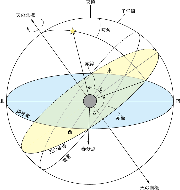 地球は自転しながら太陽の周りを公転している。地球の赤道面が天球と交わる線が天の赤道である。太陽の周りを回る地球の軌道面を黄道面といい、それが天球と交わる線が黄道である。地球の自転軸(地軸)は黄道面に垂直な方向に対して約23.4度傾いているので、天球上で黄道と天の赤道は約23.4度傾いている(図1)。