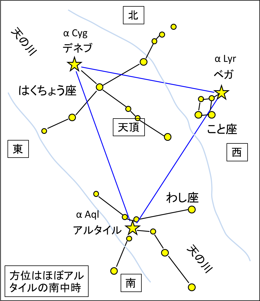 デネブ(はくちょう座α(アルファ)星:α Cyg)、アルタイル(わし座α星: α Aql)、ベガ(こと座α星:α Lyr)の三つの明るい星を結ぶ細長い大きな三角形の星のパターンのこと。七夕伝説と結びついて広く親しまれている。ベガは「おりひめ(織姫)」、アルタイルは「ひこぼし(彦星)」であり、両者の間に天の川が通っている。日本では夏の間に最も見やすくなる(20時に南中するのは9月中旬)。夏の大三角形を作る三つの星のデータを表に示す。冬の大三角も参照。