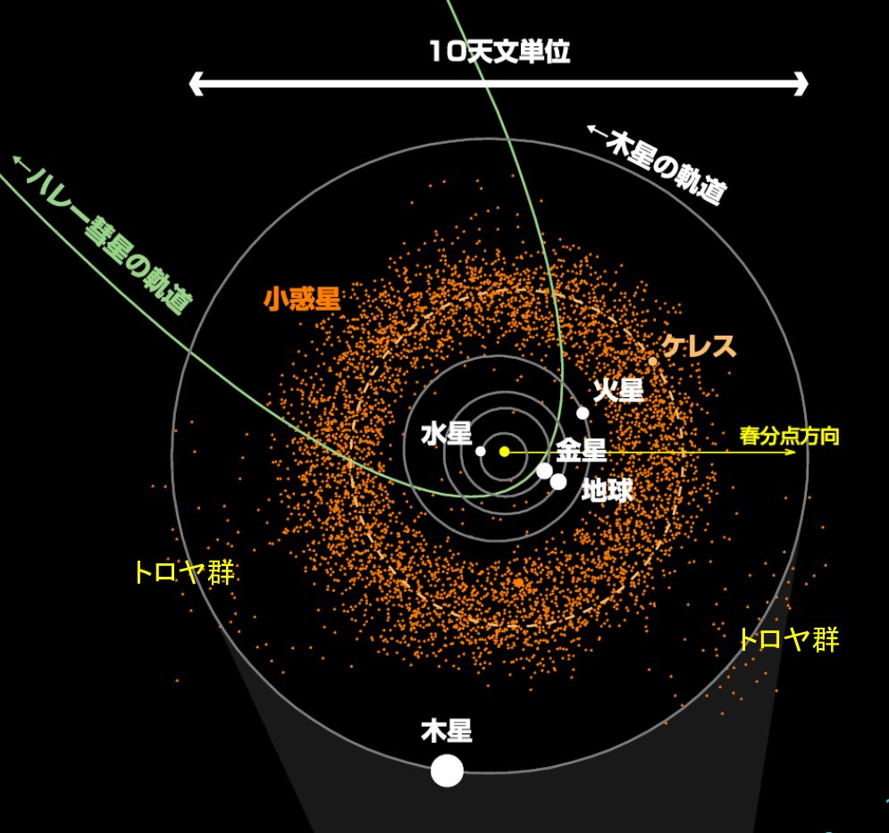 惑星の軌道面上で、太陽と惑星を結ぶ線分を底辺とする正三角形の頂点の位置に相当する2つの点は力学的に安定な平衡点(ラグランジュ点)である。惑星の軌道運動方向の前方、後方にある平衡点を、それぞれ L4 平衡点、L5 平衡点と呼ぶ。木星の場合、これらの平衡点付近には小惑星が濃集しており、通常これらをトロヤ群小惑星と呼ぶ。2019年5月時点で、木星のトロヤ群小惑星は7000個以上が見つかっている。