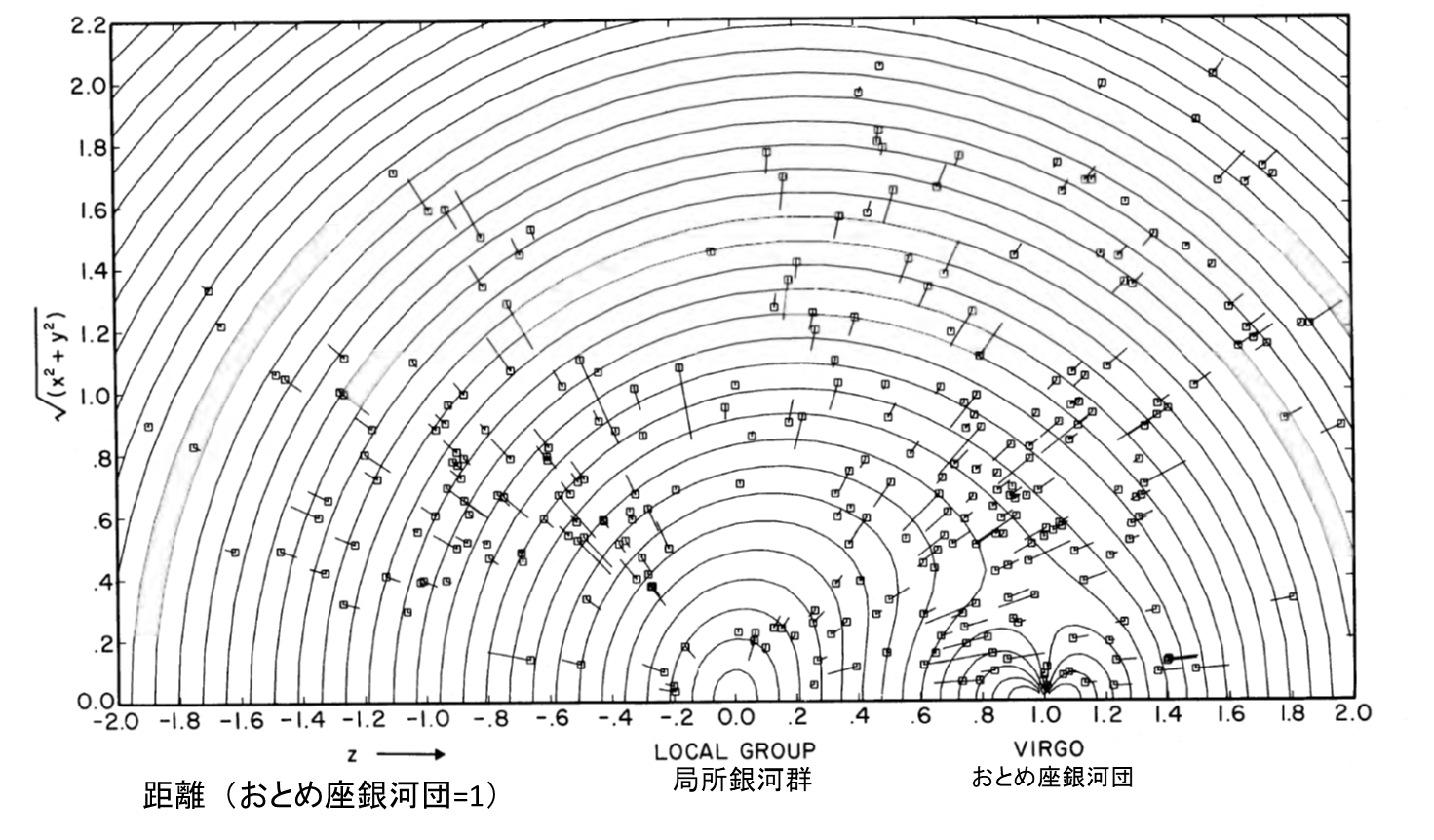 局所超銀河団の銀河がおとめ座銀河団の重力に引かれて落ち込んでいる運動のこと。多数の銀河の距離と視線速度(後退速度)を測定し、視線速度がハッブル流からどれくらいずれているかを調べる過程で1980年頃に発見された。天の川銀河(銀河系)の場所での落ち込み速度は200-300 km/sと推定されている。銀河系も局所銀河群の銀河とともにおとめ座銀河団に引かれて落ち込んでいるが、両者の距離は宇宙が膨張している(ハッブル流がある)ので広がっている。落ち込み運動の影響は、おとめ座銀河団の周辺にある銀河で、後退速度がハッブル流より遅くなる(宇宙の膨張速度が遅くなっているように見える)効果として現れる(図1, 2, 3)。さらに1986年には、宇宙マイクロ波背景放射に対する局所銀河群の運動速度は、おとめ座銀河団への落ち込み運動と、うみへびーケンタウルス座銀河団が、局所超銀河団を引き寄せている速度の合成で説明されるとして(図4)、局所超銀河団より大規模な領域で銀河が揃った運動をしていることが指摘され、それ以後超銀河団より大きなスケールでの大規模な銀河の特異運動(bulk motionあるいはstreaming motionと呼ばれる)が活発に研究されるようになった。ラニアケア超銀河団も参照。